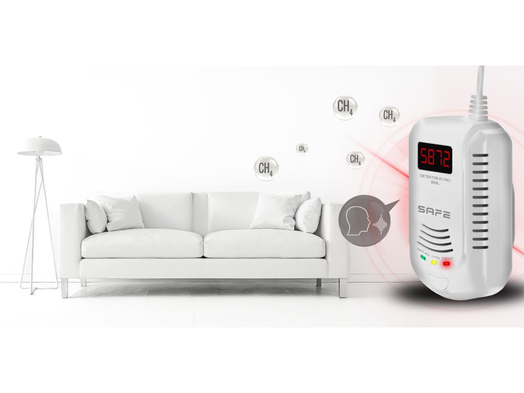 Detektor horľavých a výbušných plynov SAFE-808L s batériovým zálohovaním, digitálnym displejom a unikátnou funkciou hlasového varovania v slovenskom jazyku.