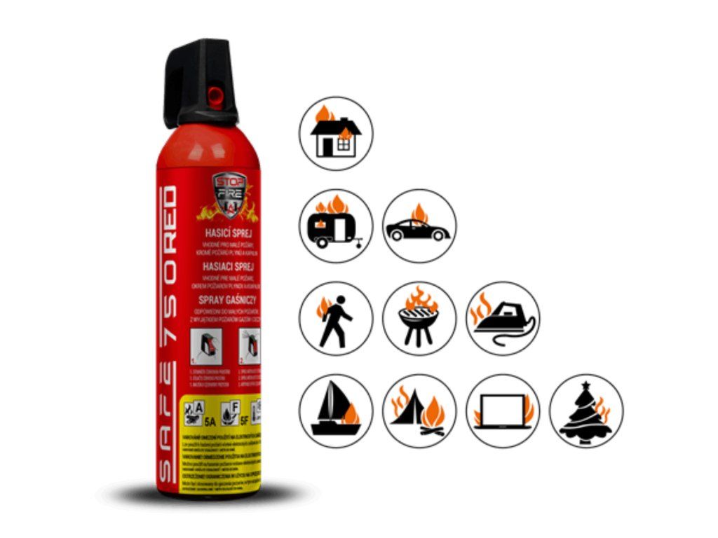 Univerzálny hasiaci sprej SAFE 750 RED certifikovaný podľa normy EN 16856 na hasenie požiarov typu A (tuhé horľavé látky), F (jedlé oleje a tuky), E (elektrické zariadenia pod napätím do 1000 V). Je primárne určený na hasenie začínajúcich požiarov v domácnostiach, kuchyniach, garážach, automobiloch, kanceláriách, chatách a pod. Možnosť použitia až do -20 °C.