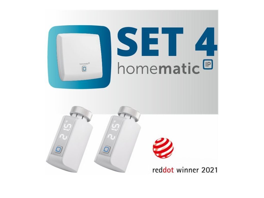 Štartovacia sada pre riadenie vykurovania HmIP-SET4 určená pre počiatočnú integráciu inteligentnej domácnosti Homematic IP. Sada obsahuje tri základné prvky pre spoľahlivé riešenie regulácie vykurovania a vzdialené riadenie priestorovej teploty v miestnosti podľa individuálnych potrieb, čo vedie k okamžitej úspore a zníženiu výdavkov na energie až o 30 %. Sada obsahuje Centrálnu jednotku HmIP-HAP, 2x Termostatickú hlavicu HmIP-eTRV-E a bezplatnú mobilnú aplikáciu v CZ lokalizácii dostupnú pre operačný systém Android a iOS.