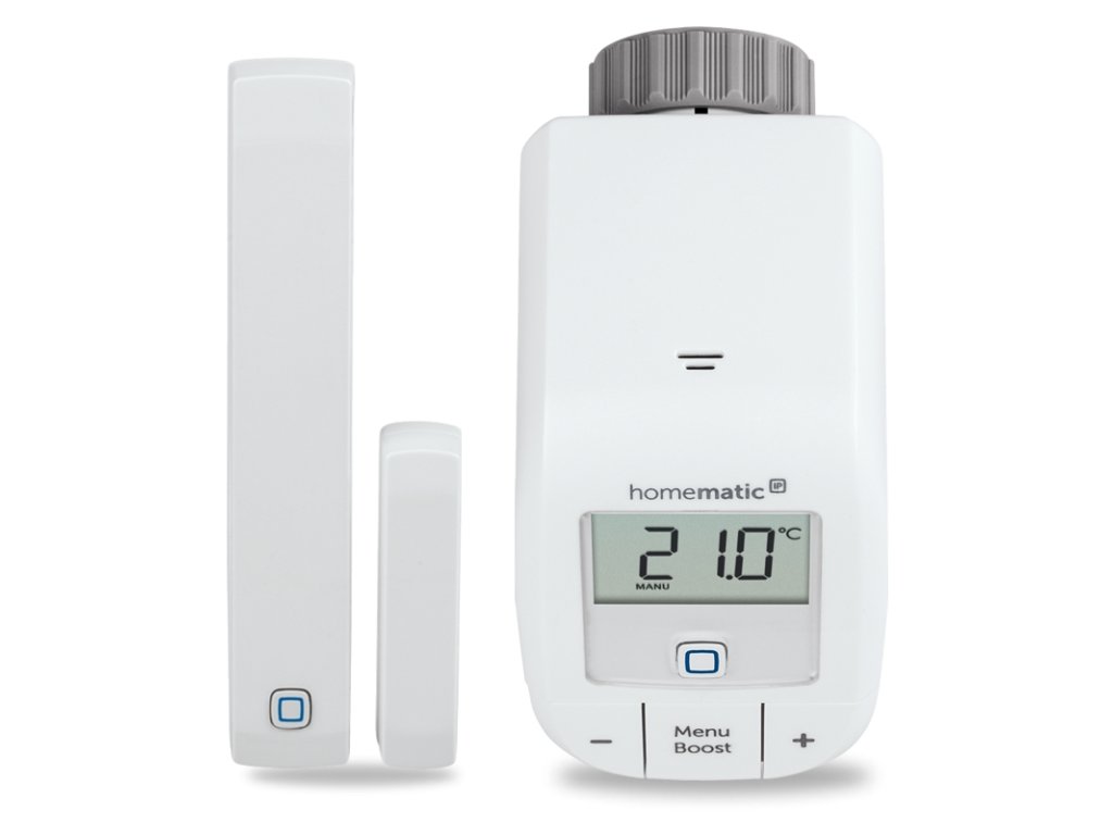 Cenovo výhodná sada pre reguláciu vykurovania obsahuje - 1x termostatickú hlavicu HmIP-eTRV-B, 1x okenný a dverový senzor - magnetický HmIP-SWDM a 1x adaptér ventilu Danfoss.
