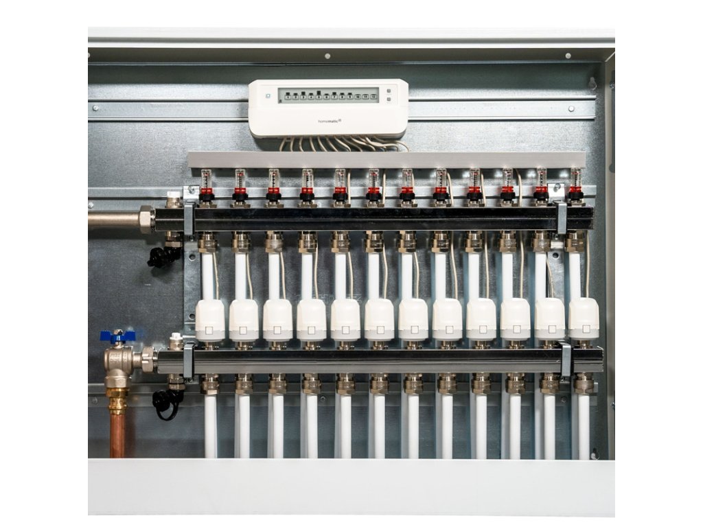 Programovateľný akčný člen vodného podlahového vykurovania s možnosťou autonómnej prevádzky a podporou prepínania medzi režimom vykurovania a chladenia. Má 12 kanálov, automatizuje procesy regulácie vykurovania a šetrí náklady na energie. Je nutné pripojiť motorizované ventily (HMIP-VDMOT), s ktorými komunikuje.