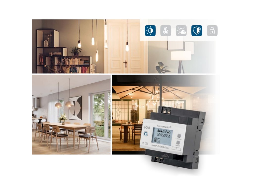 Brána DALI (HmIP-P-DRG-DALI) umožňuje jednoduchú integráciu až 32 svietidiel s komunikačným rozhraním DALI do systému Homematic IP. Tieto svetlá je možné následne spojiť až do 16 skupín, a tak ich pohodlne po jednom aj hromadne ovládať.