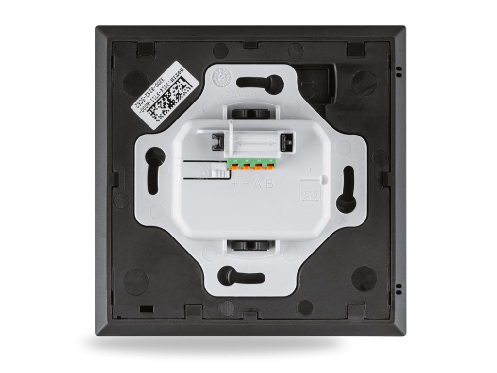 Dodávaná montážna doska je optimalizovaná pre jednoduchú montáž v zapustenej krabici. Odnímateľná push-in svorka uľahčuje pripojenie k drôtovej zbernici.