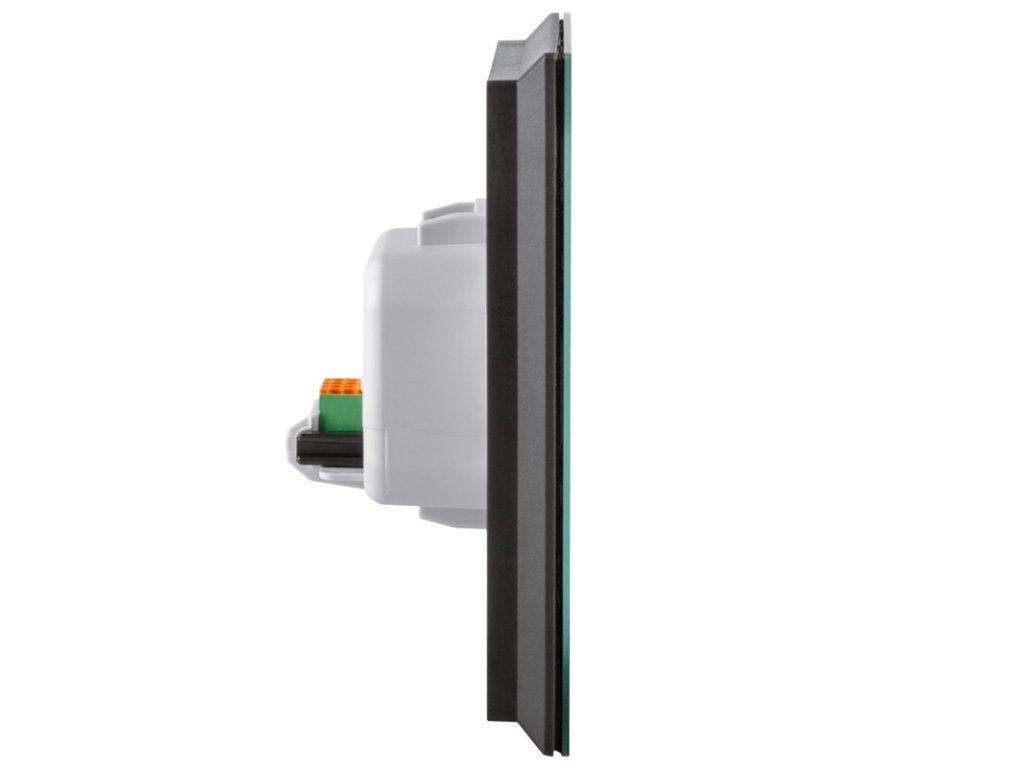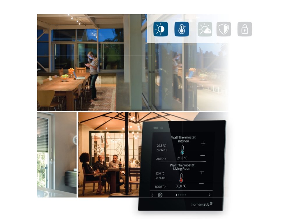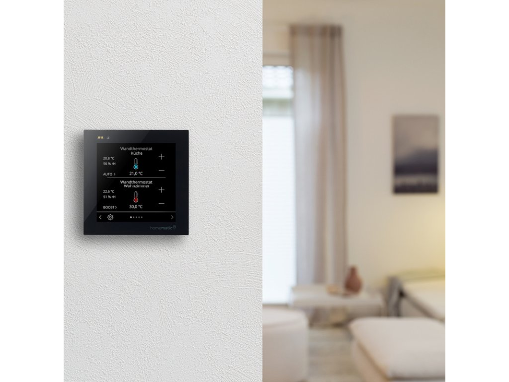 Drôtový sklenený podsvietený displej pre zapustenú montáž ovláda vykurovanie, osvetlenie a tieniace prvky. Zobrazuje vlhkosť a izbovú teplotu v miestnosti. Je možné nastaviť až 20 funkcií pre tienenie a osvetlenie a ďalej až 10 miestností pre reguláciu teploty. Umožňuje pohodlné dotykové ovládanie prvkov systému Homematic, displej má desať stránok a funkciu Quick Action.