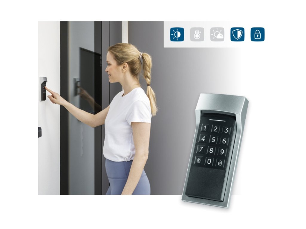 Bezdrôtová inteligentná Klávesnica (HmIP-WKP) slúži na pohodlné ovládanie prístupových ciest do objektu a systémových funkcií na základe zadania číselného kódu.