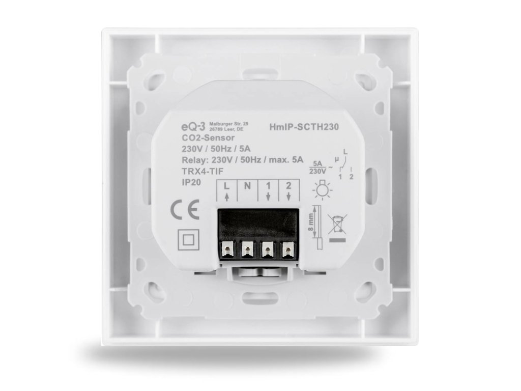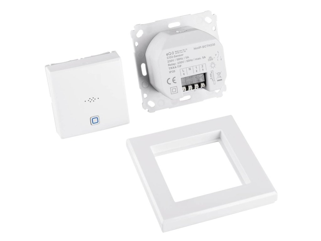 Bezdrôtový kombinovaný senzor CO2 (HmIP-SCTH230) so spínaným výstupom 230 V je určený na vnútornú inštaláciu a predstavuje inteligentný spôsob automatického sledovania hodnôt CO2, teploty a vlhkosti.