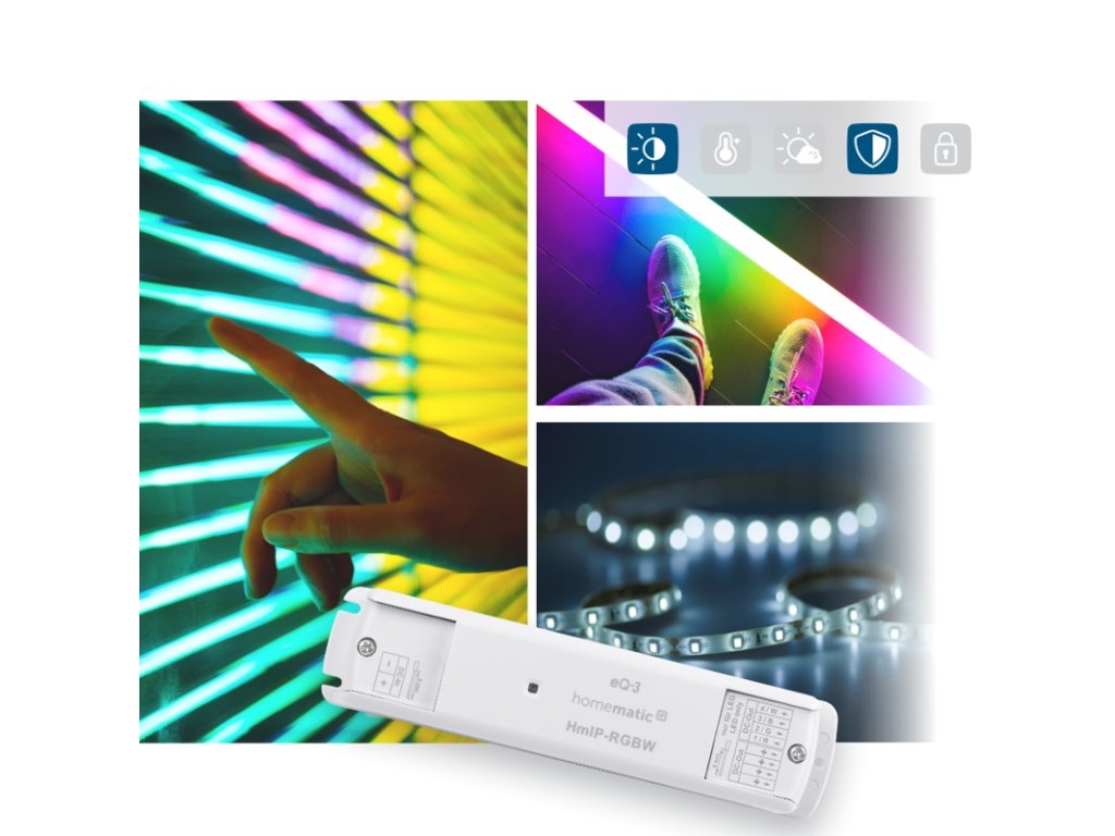 V závislosti od druhu LED pásika, umožňuje RGBW LED kontrolér (HmIP-RGBW) vzdialene zapínať/vypínať pripojené svetelné LED okruhy, **meniť farbu scény a regulovať intenzitu jasu a farebnú teplotu**.