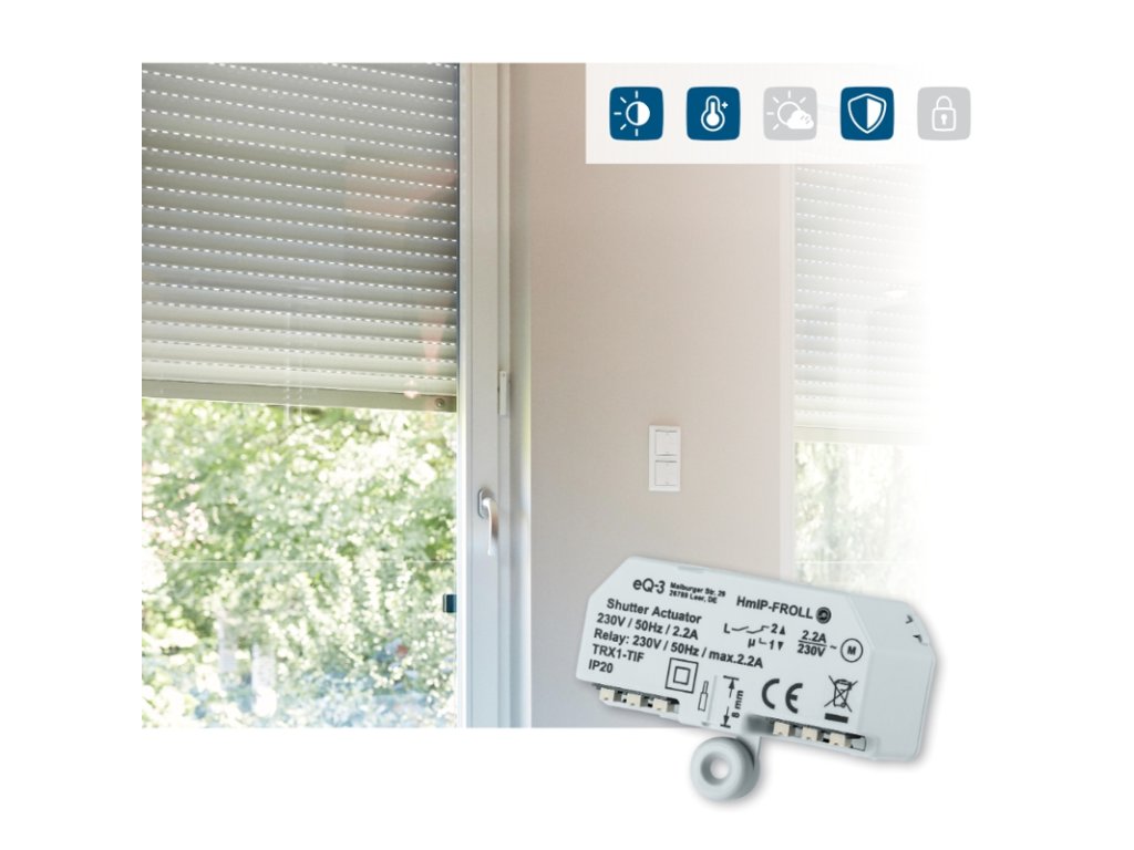 V kombinácii s Meteo senzormi (HmIP-SWO-x) môžete automatizovať zatienenie na základe úrovne jasu alebo vytiahnuť rolety v prípade prekročenia nastaviteľnej hodnoty rýchlosti vetra. Nechýba ani ochrana proti zabuchnutiu, ktorá zabráni stiahnutiu roliet v prípade, že máte otvorené okno.
