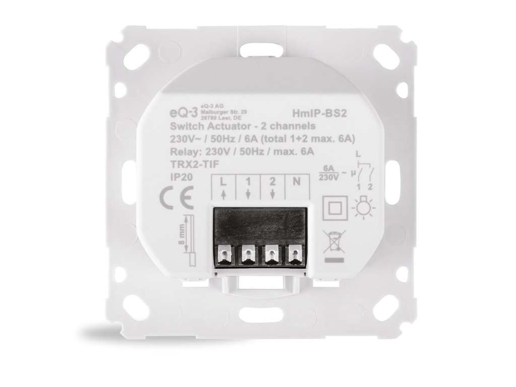 Spínací akčný člen (HmIP-BS2) sa montuje do štandardnej zapustenej elektroinštalačnej krabice pod omietku s pripojením do siete 230 V. Bezdrôtová komunikácia ponúka možnosť inštalácie bez potreby sekundárnej kabeláže. To znamená, že akčný člen je možné umiestniť v mieste pripraveného alebo existujúceho elektrického rozvodu siete 230 V.