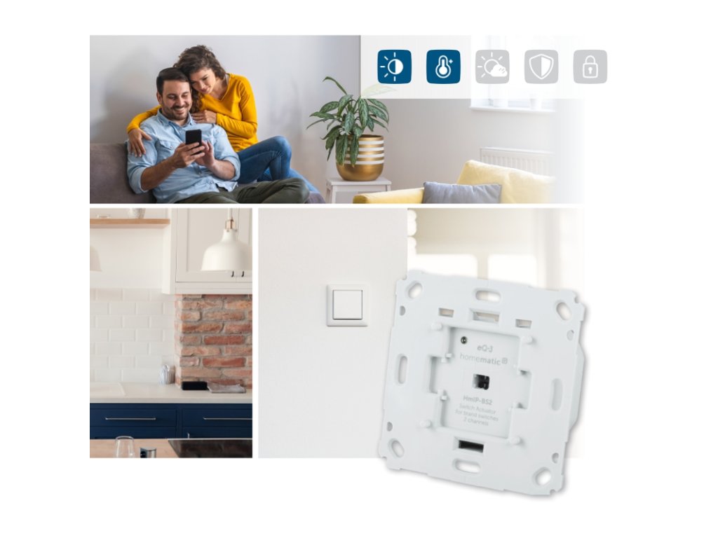 Programovateľný bezdrôtový dvojkanálový Spínací akčný člen (HmIP-BS2) pre zapustenú montáž, napájaný zo siete 230 V, je súčasťou systému inteligentnej domácnosti Homematic IP.