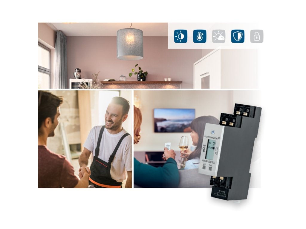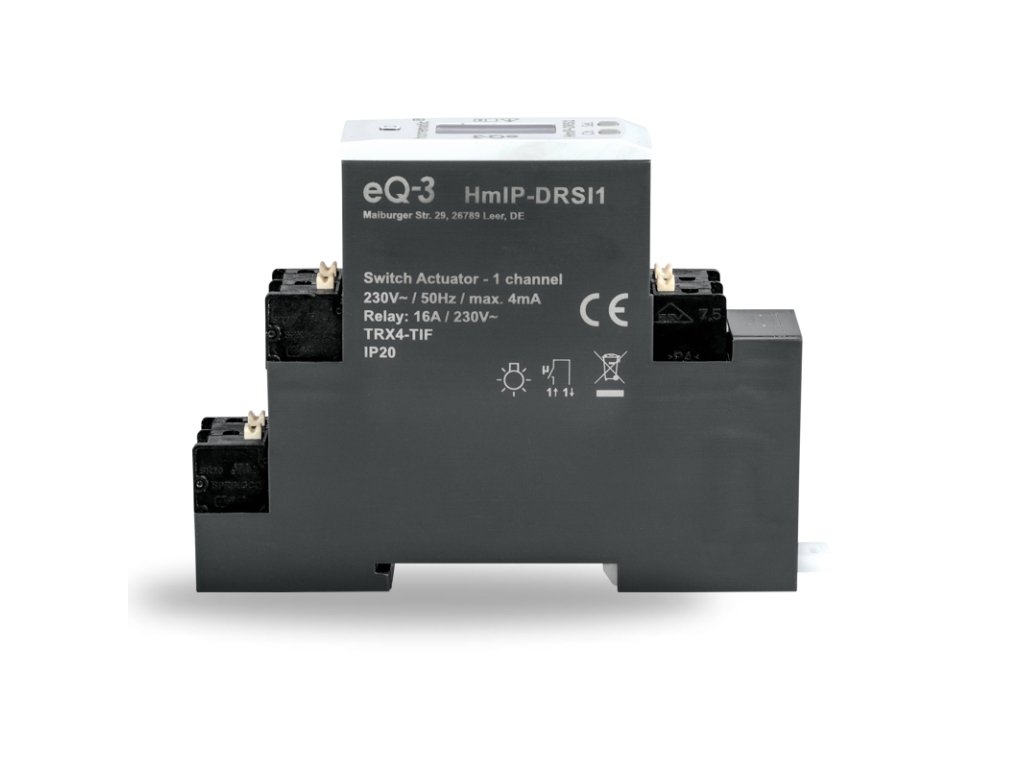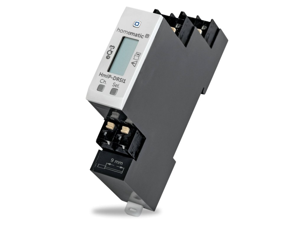 Programovateľný bezdrôtový **jednokanálový Spínací akčný člen s LCD (HmIP-DRSI1)** pre montáž na DIN lištu, napájaný zo siete 230 V a certifikovaný organizáciou VDE, je súčasťou systému inteligentnej domácnosti Homematic IP.