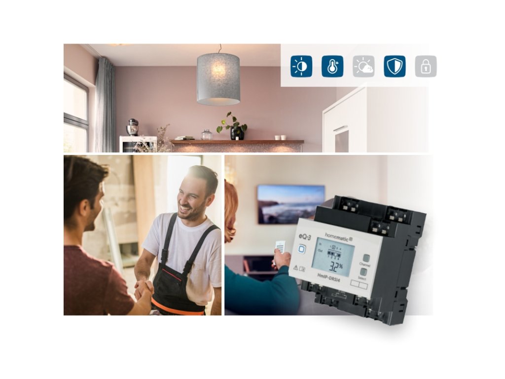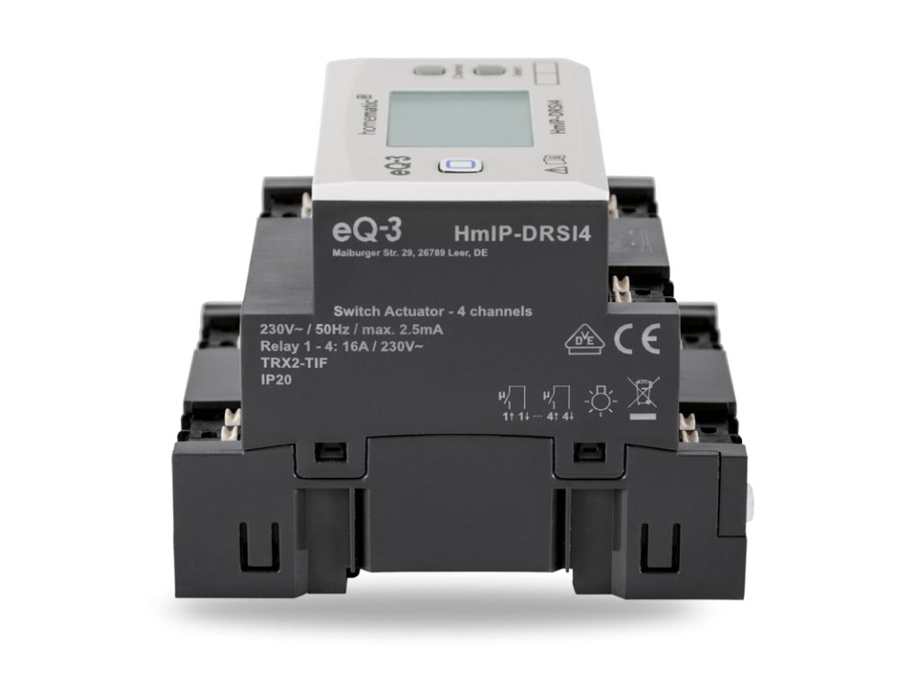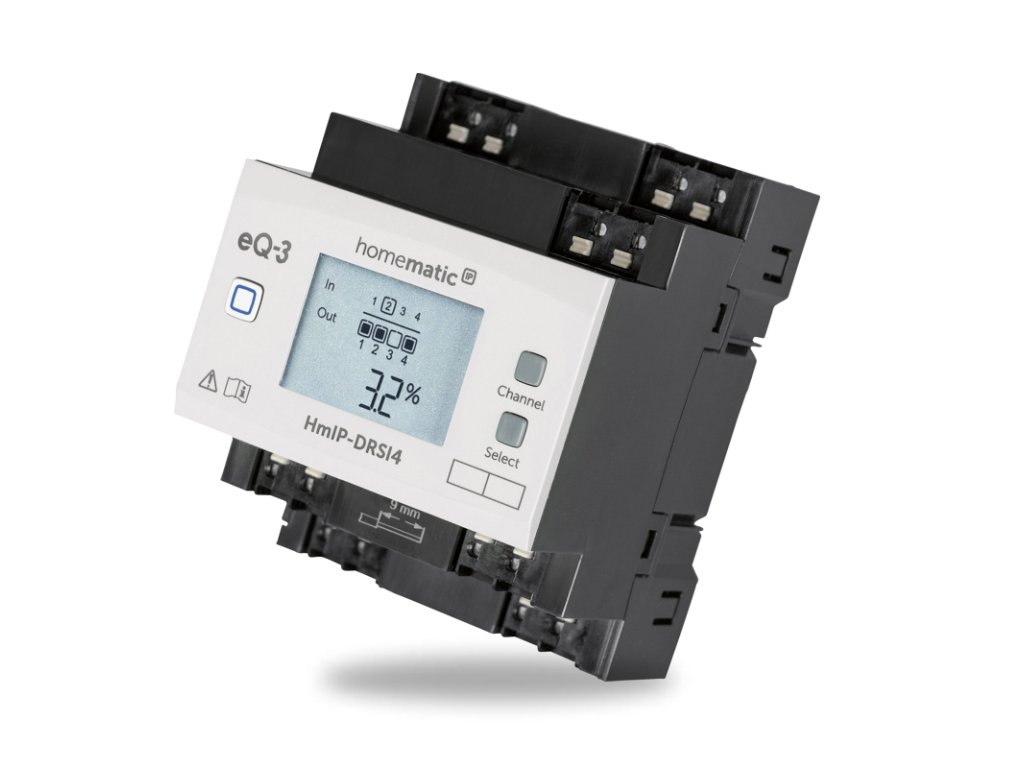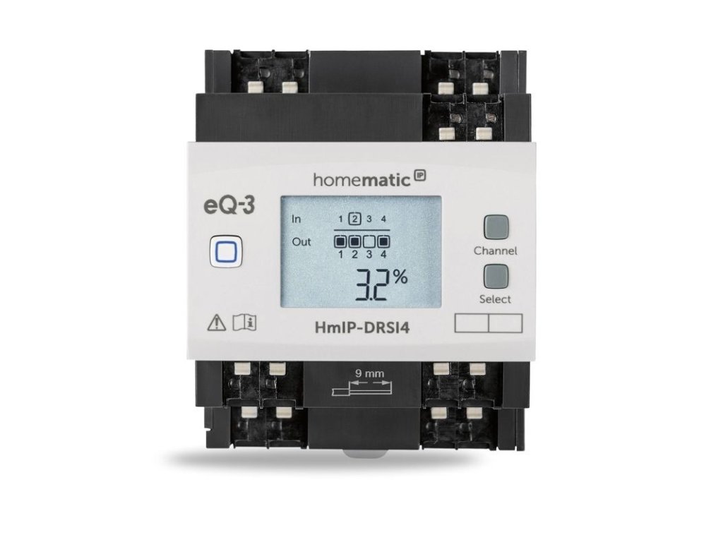 Programovateľný bezdrôtový **štvor-kanálový Spínací akčný člen s LCD (HmIP-DRSI4)** pre montáž na DIN lištu, napájaný zo siete 230 V a certifikovaný organizáciou VDE, je súčasťou systému inteligentnej domácnosti Homematic IP.