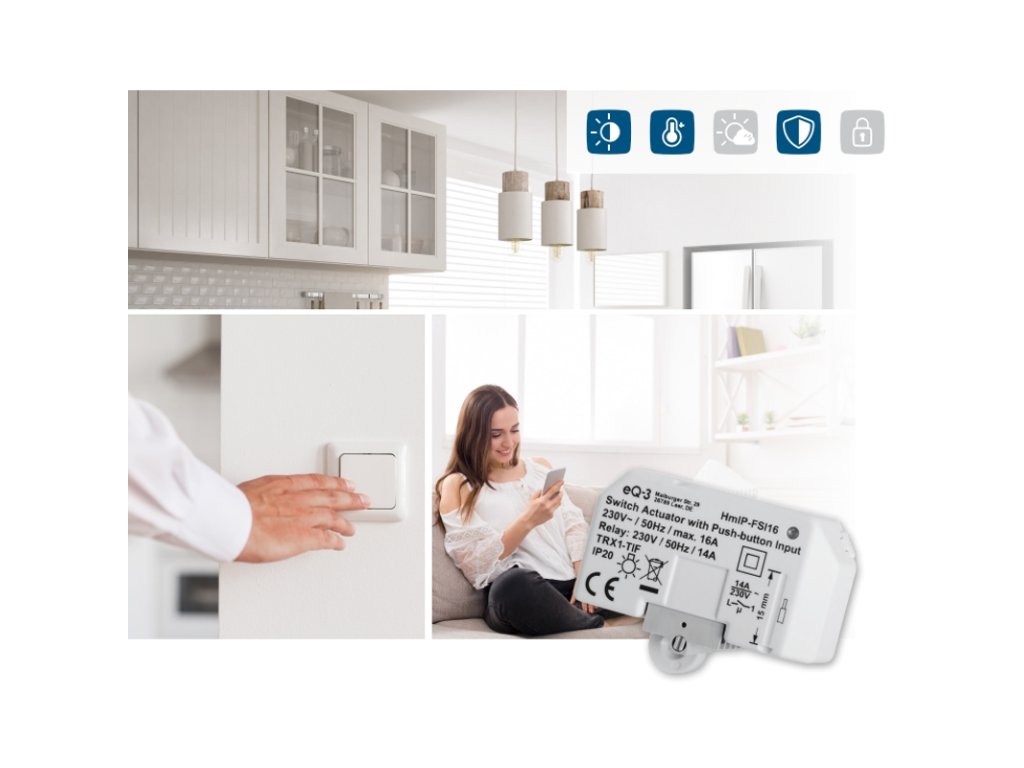 Programovateľný bezdrôtový Spínací akčný člen so vstupom pre tlačidlo (HmIP-FSI16) pre skrytú montáž, napájaný zo siete 230 V, je súčasťou systému inteligentnej domácnosti Homematic IP.