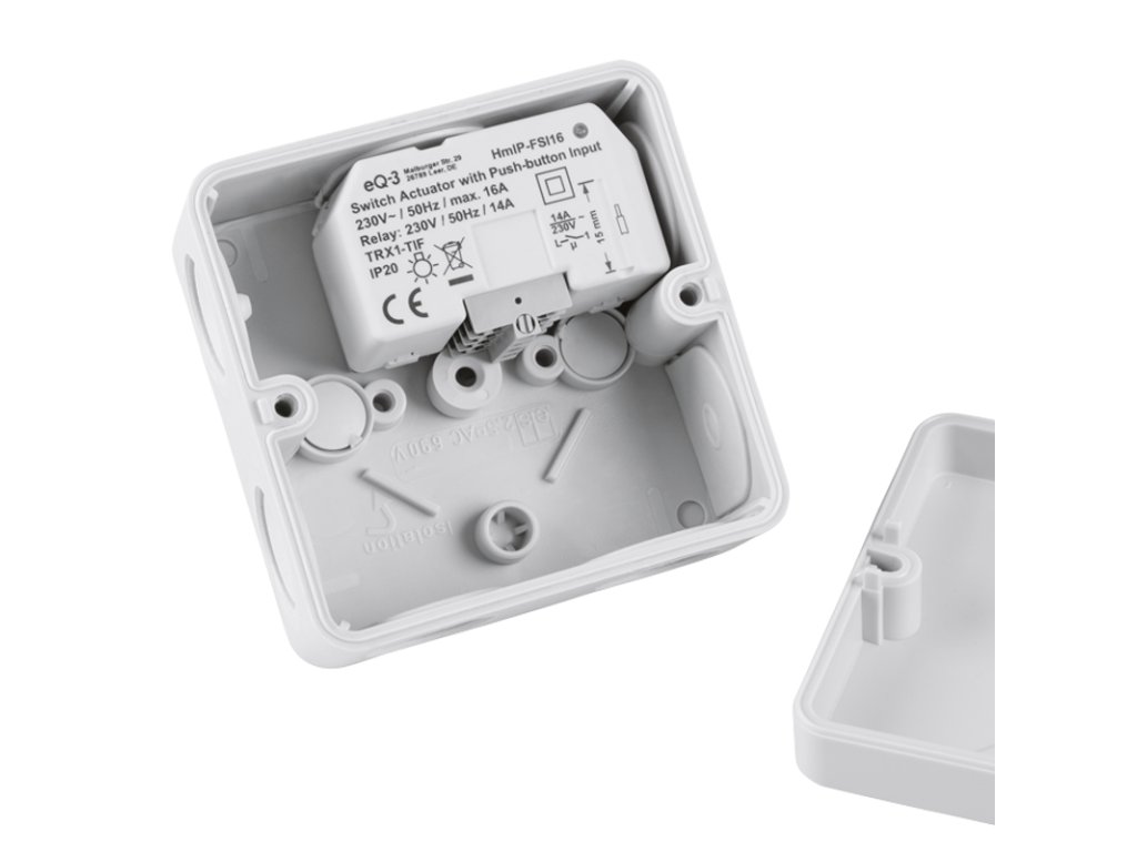 Spínací akčný člen so vstupom pre tlačidlo (HmIP-FSI16) sa montuje do štandardnej **zapustenej krabice pod omietku alebo do krabice pre povrchovú montáž** s pripojením do siete 230 V. Bezdrôtová komunikácia ponúka možnosť inštalácie bez potreby sekundárnej kabeláže. To znamená, že akčný člen je možné umiestniť v mieste pripraveného alebo existujúceho elektrického rozvodu siete 230 V.