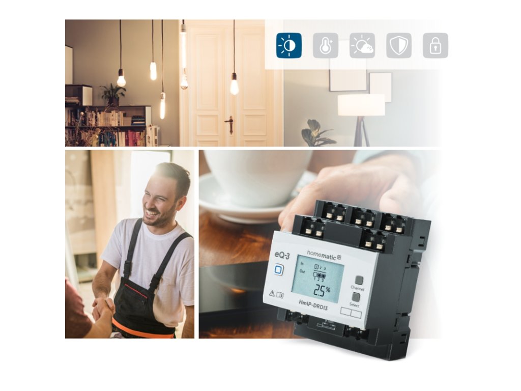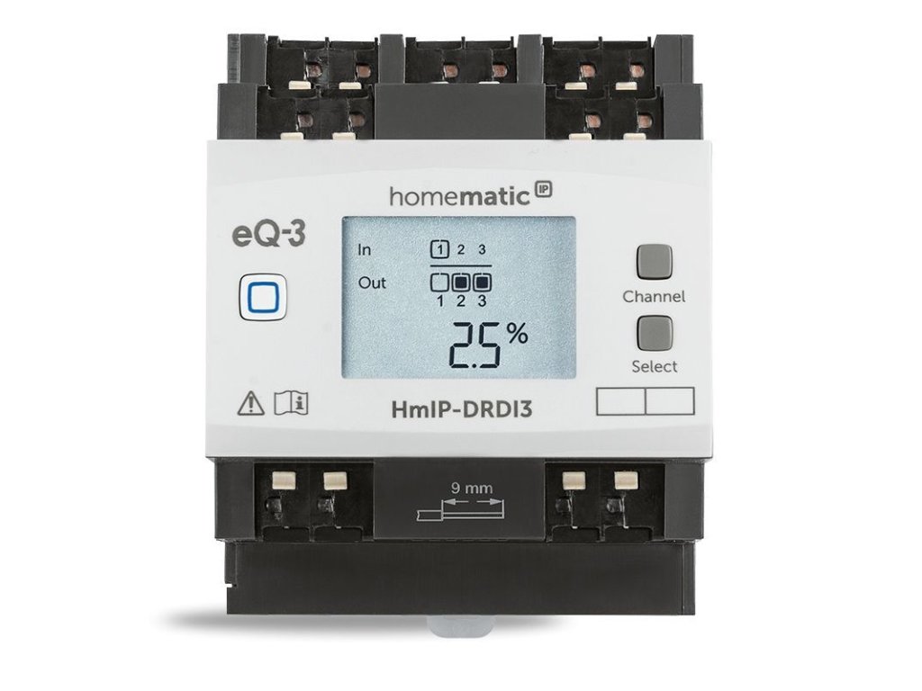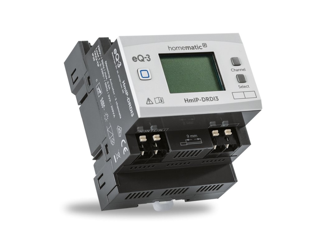 Programovateľný bezdrôtový trojkanálový Stmievací akčný člen s LCD (HmIP-DRDI3) pre montáž na DIN lištu, napájaný zo siete 230 V a certifikovaný organizáciou VDE, je súčasťou systému inteligentnej domácnosti Homematic IP.