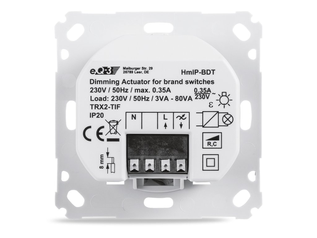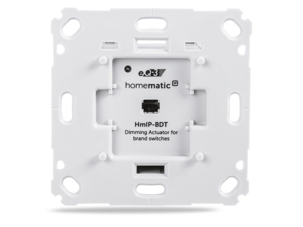 Stmievací akčný člen (HmIP-BDT) sa montuje do štandardnej zapustenej krabice pod omietku s pripojením do siete 230 V. Bezdrôtová komunikácia ponúka možnosť inštalácie bez potreby sekundárnej kabeláže. To znamená, že akčný člen je možné umiestniť v mieste pripraveného alebo existujúceho elektrického rozvodu siete 230 V.