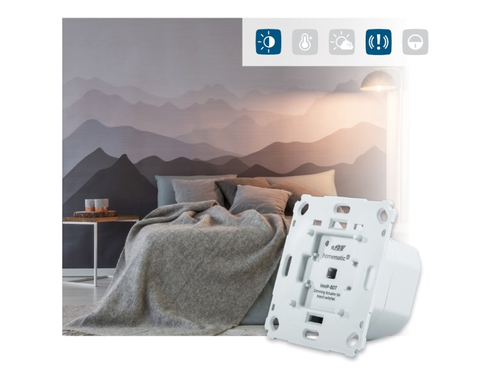 Umožní spínať, vypínať a **stmievať pripojené svetelné okruhy**. Pripojené svetlá je možné ovládať manuálne tlačidlami kolískového krytu akčného člena alebo vzdialene v kombinácii s Centrálnou jednotkou (HmIP-HAP) a mobilnou aplikáciou Homematic IP.