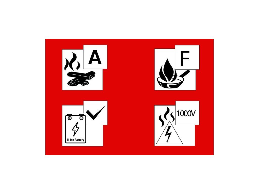 - Triedy požiaru: A (tuhé látky), F (oleje a tuky), E (lítiové batérie do 100Wh a elektrické zariadenia pod napätím do 1000V)