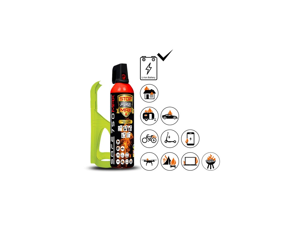 SAFE 750 MAX však ponúka oveľa viac. Je jedným z mála hasiacich prostriedkov na trhu, ktorý dokáže účinne hasiť aj začínajúce požiare lítiových batérií. Tieto batérie sú dnes bežnou súčasťou mnohých produktov, ako sú vysávače, elektrobicykle, elektrokolobežky, drony, telefóny, počítače a ďalšie elektronické zariadenia.