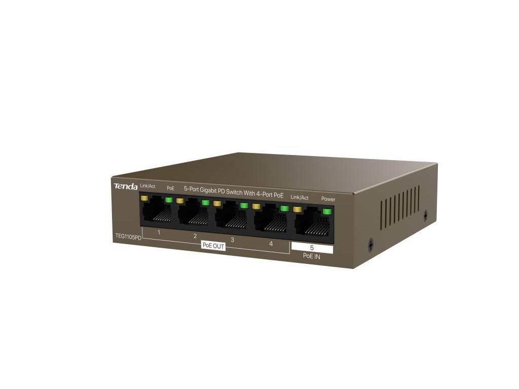Tenda TEG1105PD je 5-portový Gigabitový Ethernet PoE switch. Je napájaný pomocou PoE a zároveň napája ďalšie zariadenia prostredníctvom PoE. 1 port slúži na napájanie samotného switchu a ďalšie 4 PoE porty 10/100/1000 Mb/s podporujú PoE 802.3af (spolu 4 porty, max. 30 W). Fanless prevedenie – bez ventilátora, zaisťuje tichú prevádzku.